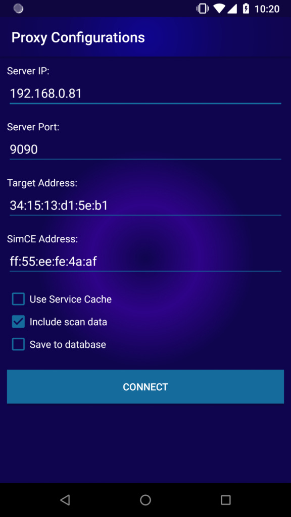 When the application starts, the proxy settings must first be configured. Once the controller connects to the Java server, the BLE:Bit Central and BLE:Bit Peripheral devices attached to the Raspberry Pi can be controlled through the Android application by way of that server.