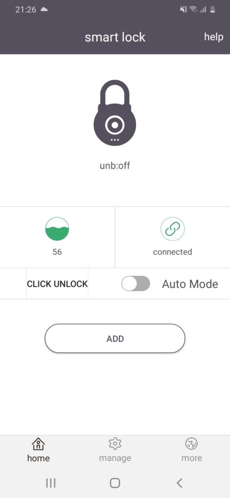 We tested a smart lock that becomes active when pressed and then waits for a client to connect. The lock is supported by both Android and iOS applications. Once the Android application discovers the device, it connects to the lock, and pressing the unlock button in the vendor’s application unlocks it.