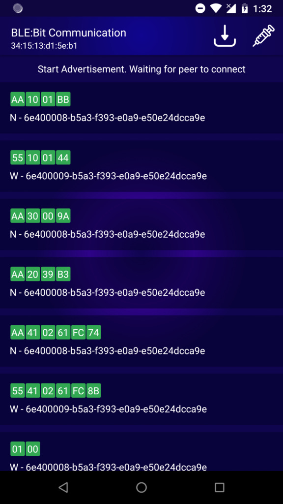 Our initial goal is to perform a man in the middle attack in order to better understand the application layer protocol used between the Android application and the BLE enabled device. To do this, we use both BLE:Bit Central and BLE:Bit Peripheral.